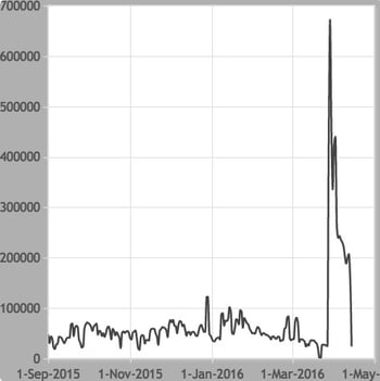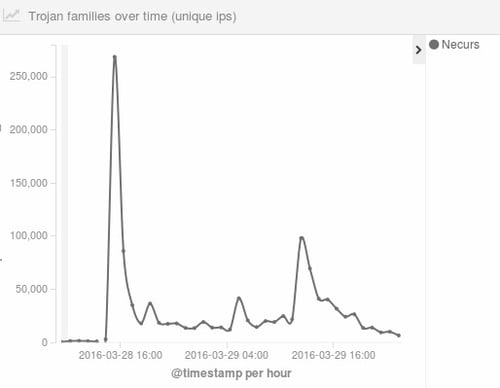 كان عدد الحالات المصابة بمعدل 50،000 عنوان IP في 24 ساعة لعدة أشهر، وهذا العدد كان في تباطؤ وانخفاض على مر الزمن. ومع ذلك، في 28 مارس 2016، رأينا فجأة زيادة كبيرة في أعداد الإصابة. بلغت عددها على مدى 24 ساعة 650.000. ثم انخفض هذا الرقم ببطء خلال الأيام التاليه حتى وصل عدد العدوى المعتاد.