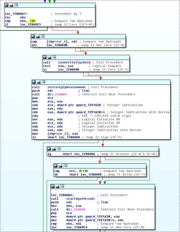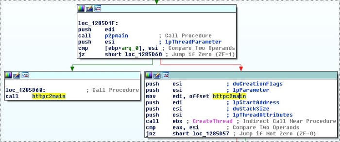 عندها بدأنا في البحث عن سبب ممكن لجميع هذه الاتصالات الجديدة،في الخدمات المفتوحت المصدر ووسائل الإعلام. ومع ذلك، لم نتكن من ايجاد أية أدلة ، او حتى من خلال OSINT. ثم قررنا أن ننظر إلى البرمجيات الخبيثة مرة أخرى لفترة وجيزة و مراجعة طريقة عمل قنوات اتصال شبكتها عند تنفيذ البرامج الضارة، ويبدأ اتصال روتين P2P (وتسمى p2pmain في الصورة أدناه)، وبعد ذلك يدعو مباشرة الأمر HTTP وروتين السيطرة (وتسمى httpc2main أدناه) مباشرة أو في تريد "thread"جديد (في هده الحاله يعمل البرنامج الخبيت كسيرفس).