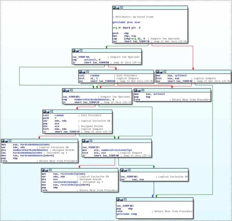 توضح الصورة التالية وظيفة getc2addr. في حالة وجود C2 إرجاع عنوان C2 النشط (arg0 دائما 0 في محاولة الاتصال الأولى). إذا لم يحدث ذلك فإن الدالة تقوم بإرجاع أحد العناوين ضمنية، أو واحد من العناوين الواردة من خلال شبكة P2P.