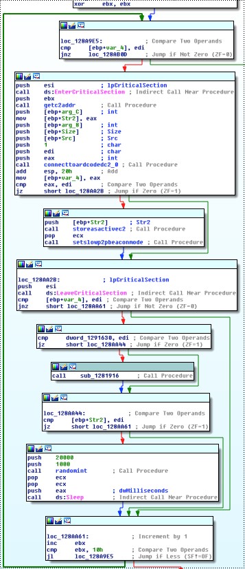 بمجرد أن يتم تنفيذ أسلوب الاتصال HTTP C2، و تحصل البرمجيات الخبيثة على عنوان IP من C2 (باستخدام وظيفة تسمى getc2addr أدناه)، يحاول الاتصال به. إذا كان الاتصال ناجحا يخزن هذا العنوان في متغير عمومي (باستخدام وظيفة تسمى storeasactivec2 أدناه) التي سيتم إرجاعها بواسطة الأسلوب getc2addr في محاولات الاتصال التالية.